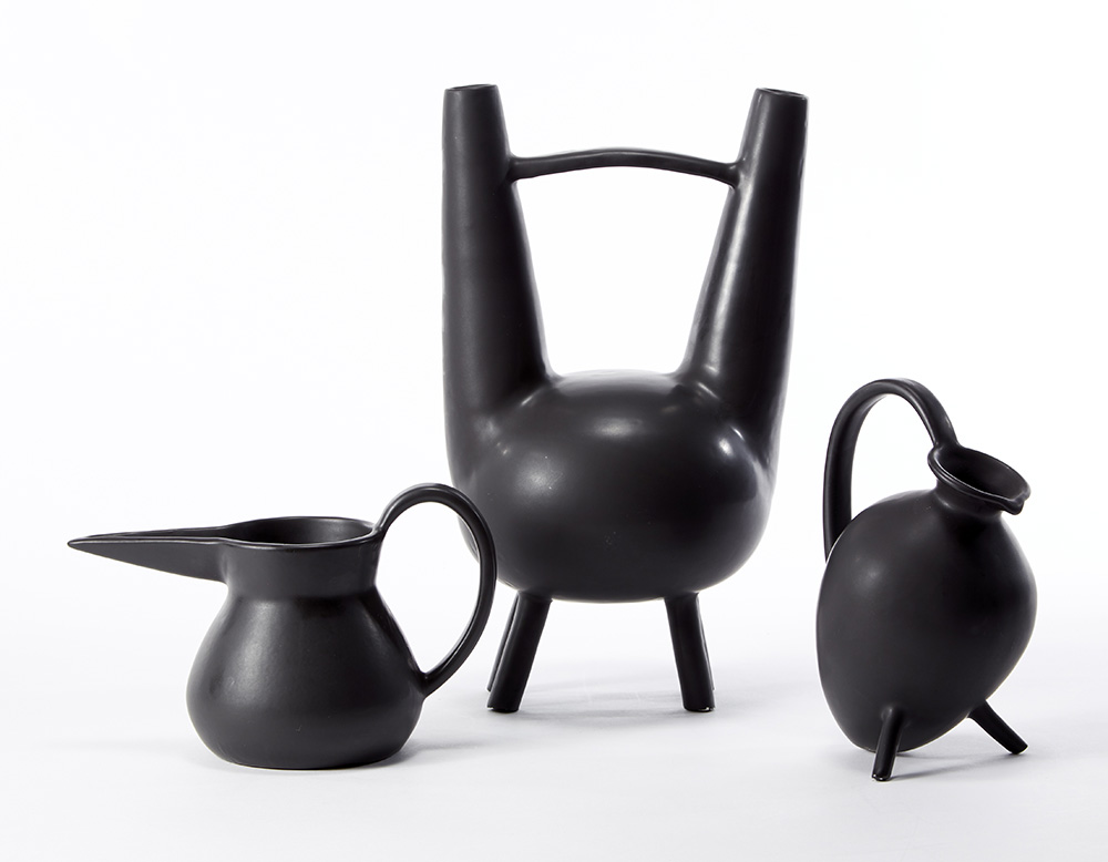 Tre vasi in ceramica smaltata in nero, realizzati su disegno di Gio Ponti. Esecuzione Pampaloni, Firenze, anni '90. Marcati sotto la base "Pampaloni - argentieri dal 1902" e con il monogramma della manifattura. (h cm 41; h cm 17; h cm 25) (lievi difetti)
