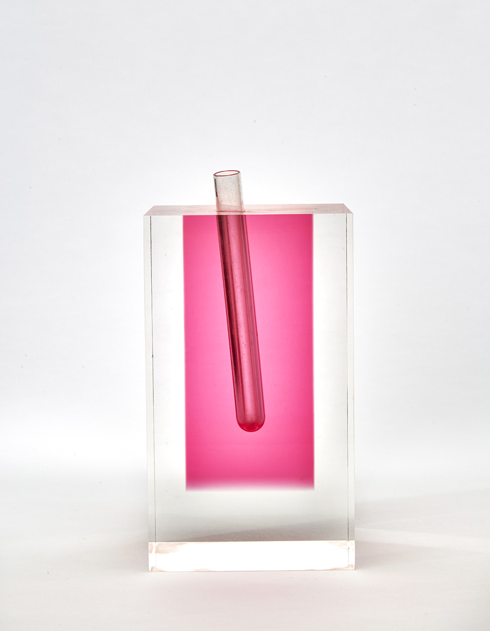 Vaso soliflore modello "#2". Esecuzione Ishimaru Co. Giappone, 1989. Blocco parallelepipedo in resina acrilica incolore e rosa fluo, provetta di vetro. (cm 11x21x11)