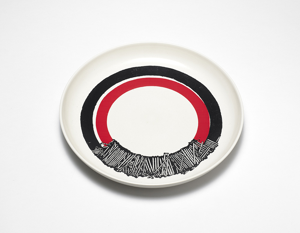 Piatto in ceramica smaltata e decorata in rosso e nero su fondo bianco. Marcato, firmato e numerato 34/200 sotto la base. (d cm 38) (lievi difetti)