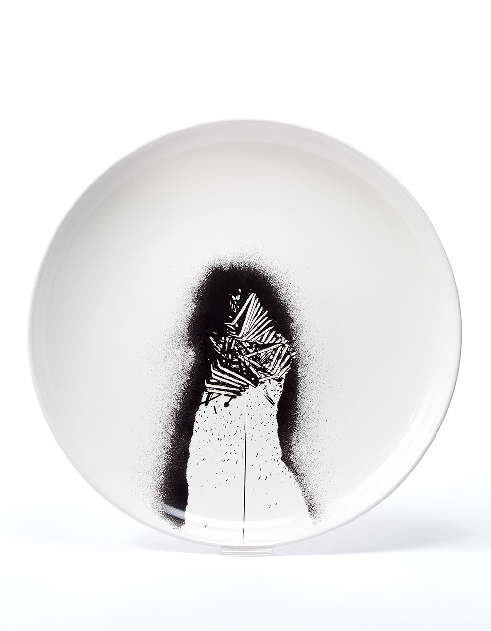 Piatto in ceramica smaltata e decorata in nero su fondo bianco. Firmato e numerato 4/50 sotto la base. (d cm 44)