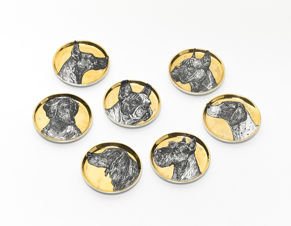 Lot composed of seven gold lacqurered and black silk-screen printed saucers of the series "Cani". Milan, 1960s. Gold marked and numbered on verso. In casebox. (d 10 cm.) (slight defects)