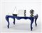 Scultura composta da un tavolino di forme barocche dipinto in blu con piano a specchio, una sfera e un cubo specchiati