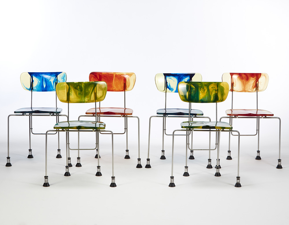 Sei sedie modello "543 Broadway". Produzione Bernini, Italia, 1993. Struttura in acciaio inox con quattro gambe e piedini a molla; schienale e seduta in resina epossidica multicolore. Marcate "DES GAETANO PESCE BERNINI ITALY" sotto la seduta. (cm 50,5x74,5x44,5)