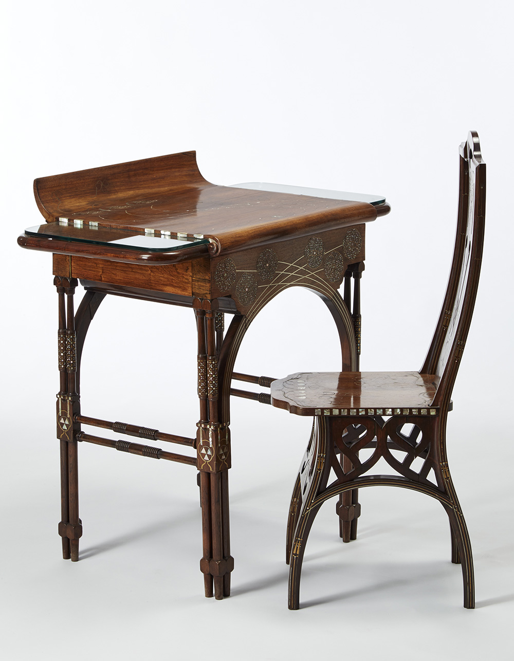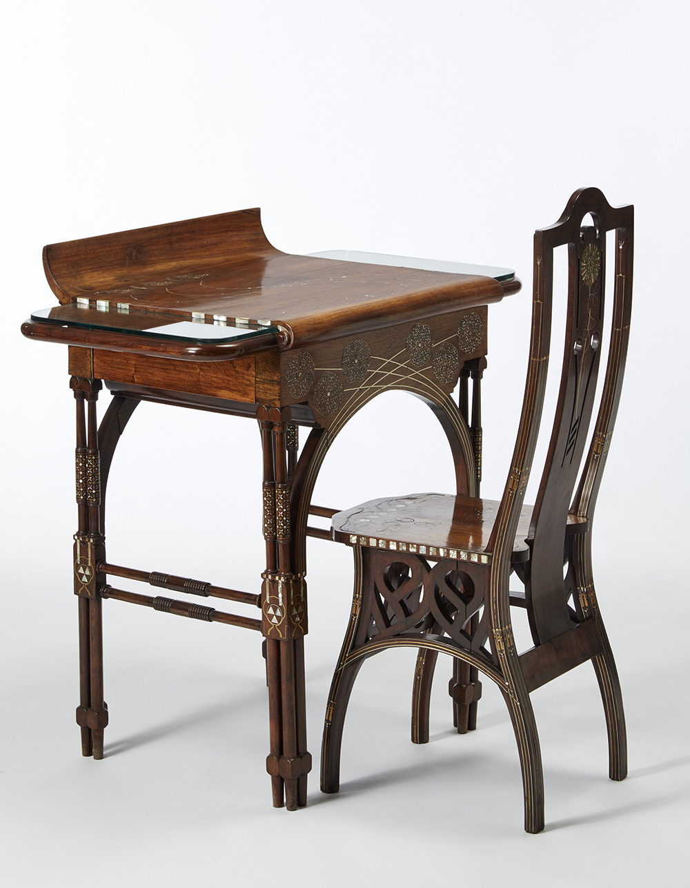 Scrittoio e sedia liberty in legno di noce d'India intarsiato in argento, ottone e madreperla con decoro floreale e geometrico. L’impugnatura su entrambi i lati consente l’apertura rotante di un cassetto. Ripiani laterali in vetro molato. Milano, 1900ca. Firma a intarsio sul piano. (toilette: cm 80x80x53; sedia: cm 90x40x40) (difetti)