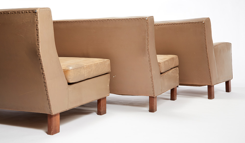 Salottino composto da due divanetti e una poltrona con struttura in legno, gambe in legno massello a sezione ottagonale, rivestimento in pelle beige. Esecuzione Pierino Frigerio, Cantù, 1962ca. (divanetti: cm 127x82x70; poltrona: cm 77x80x77) (difetti)
