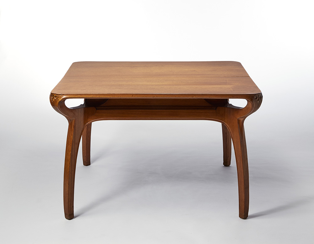 Tavolo liberty in legno di noce moiré, piano quadrato allungabile, gambe arcuate intagliate ai quattro angoli con motivi floreali. Milano, 1906ca. (cm 133x83x192) (lievi difetti)