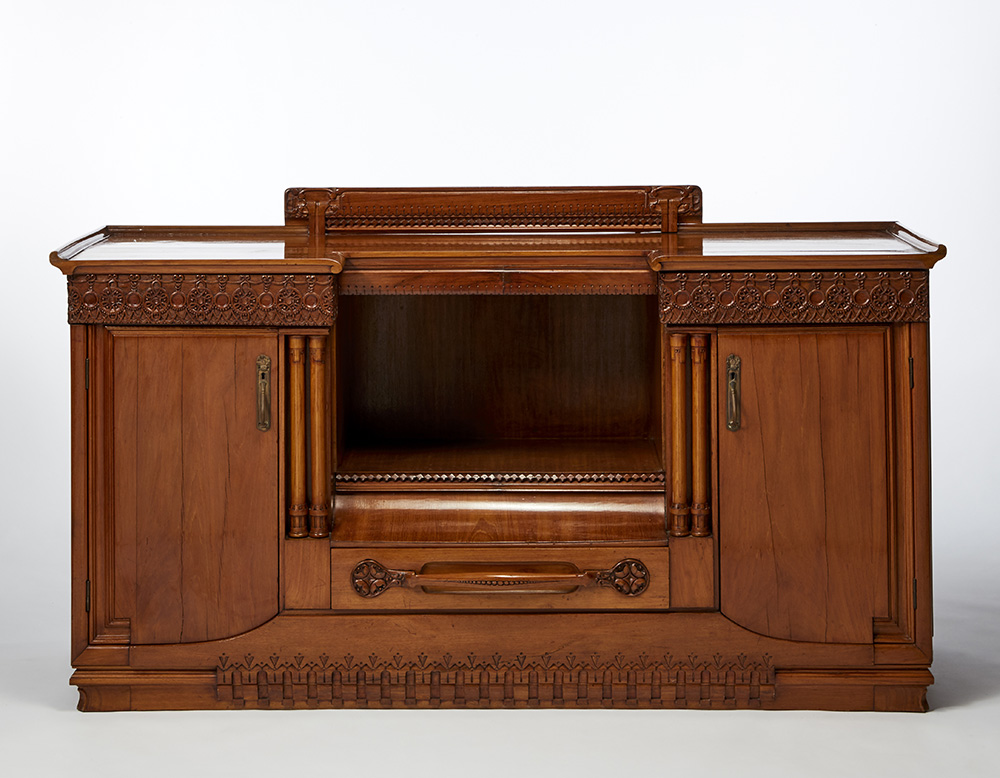 Credenza in noce d'india massello e lastronato in legni diversi, finemente intagliata con motivi geometrici a ghirlanda, greche a rombi e patere. Due cassetti nella fascia sottopiano, un vano a giorno centrale, due ante laterali e un cassetto centrale. Interni parzialmente in rovere. Milano, 1905ca. (cm 183x103x56)