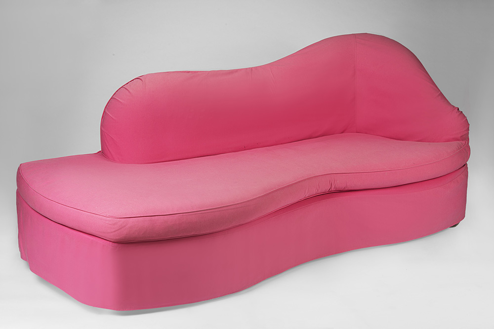 Padded sofa with sinuous profile, wooden structure, hemp fabric lining, pink fabric sofa cover. Italy, recent production. (215x88x97 cm.) (slight defects)