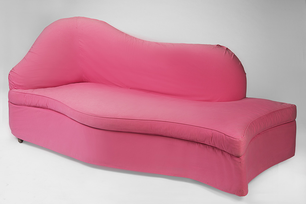 Padded sofa with sinuous profile, wooden structure, hemp fabric lining, pink fabric sofa cover. Italy, recent production. (215x88x97 cm.) (slight defects)