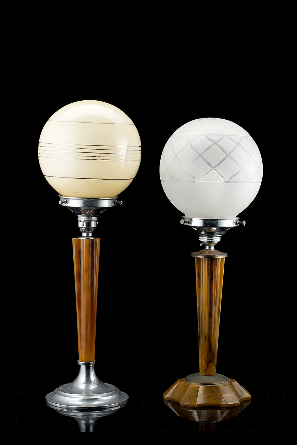 Due lampade da tavolo di gusto déco con struttura in metallo stampato e cromato, plastica e resina di color ambra venato; diffusori a globo in vetro rispettivamente inciso e satinato sulla superficie esterna e in vetro incamiciato bianco crema profilato in argento. Secolo XX. (h cm 41; h cm 44) (lievi difetti e restauri)