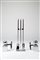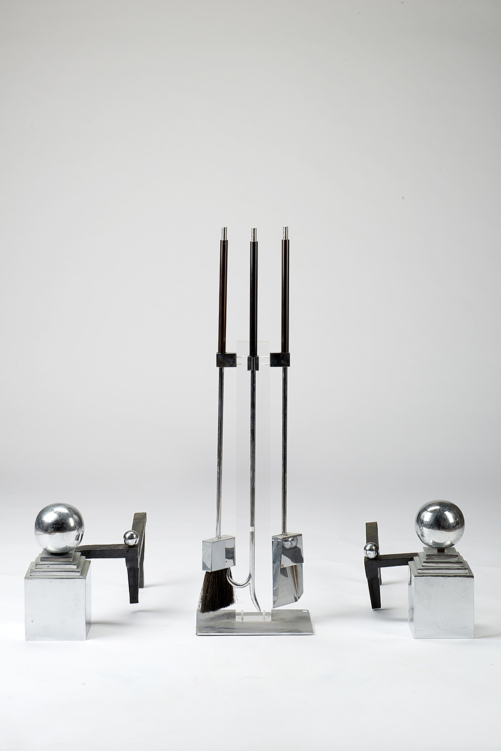 Coppia di alari e servizio da camino di gusto déco composto da una scopetta, un rampone e una paletta con relativo piedistallo in acciaio perspex, realizzati in ferro battuto e in fusione metallica cromata. Secolo XX. (misure diverse)