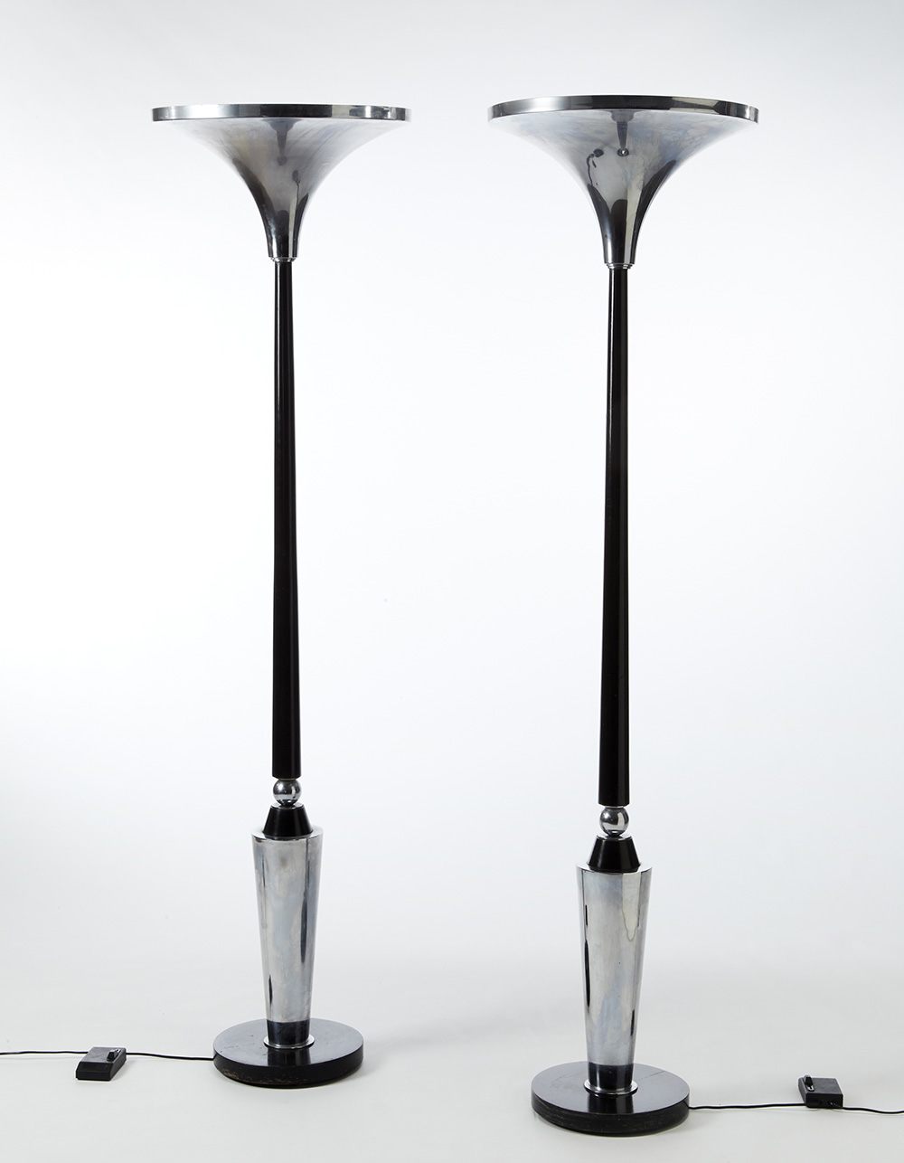 A pair of Déco-style floor lamps with ebonized wood structure and chrome metal; chromed and white painted aluminum diffuser. 20th century. (h cm 187; h cm 185) (slight defects and restoration)
