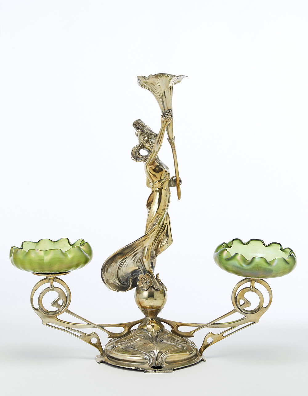 Centrotavola Art Nouveau in fusione di metallo argentata raffigurante una fanciulla reggente una campanula e recante due coppe portaoggetti in vetro soffiato iridescente. Inizio secolo XX. Recante monogramma della manifattura parzialmente leggibile sotto la base. (cm 56x55x21) (lievi difetti)