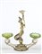 Art Nouveau silver metal centerpiece depicting a girl with a bell and two iridescent blown glass cups. Early 20th century. Monogram of the manufacture partially readable under the base. (56x55x21 cm.) (slight defects)