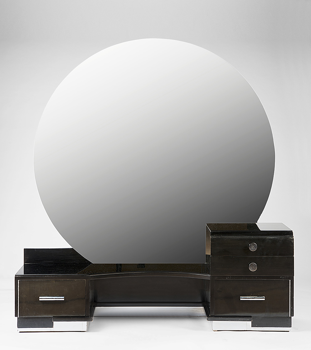 Mobile toilette di gusto déco a due sportelli e due cassetti con alzata a specchio di forma circolare. Struttura in legno verniciato nero all'anilina, piani in opalina nera, maniglie e fascia di base in metallo cromato. Secolo XX. (cm 151x161x34) (lievi difetti e restauri)