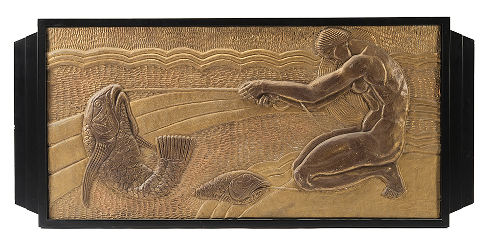"Pesca" Bassorilievo di gusto déco in gesso patinato oro inserito in cornice...
