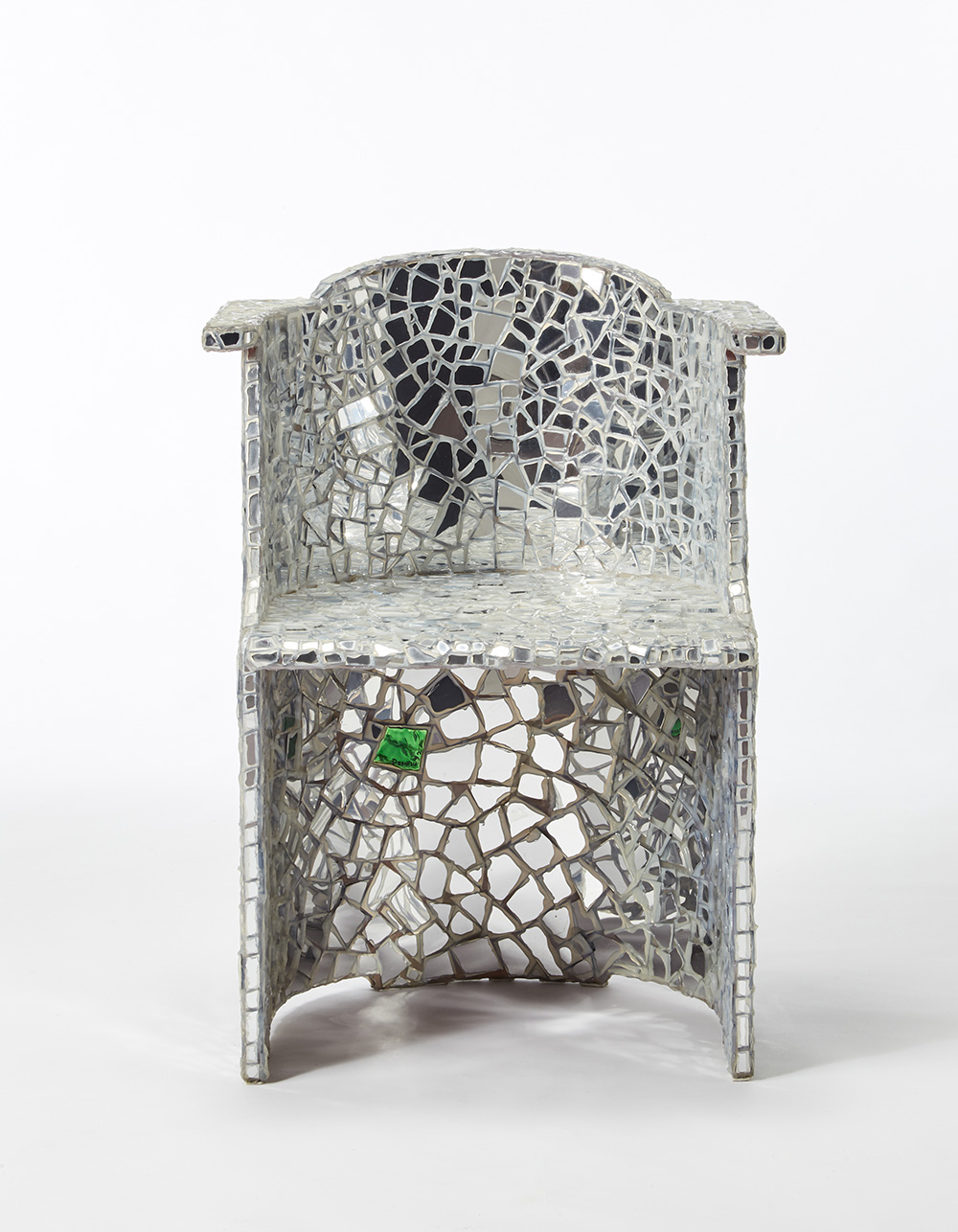 Poltroncina con struttura in multistrato rivestita con cocci di specchio e silicone. 1992. Recante firma "D. ZANELLA 92" sul lato interno. (cm 57x74x43) (lievi difetti)