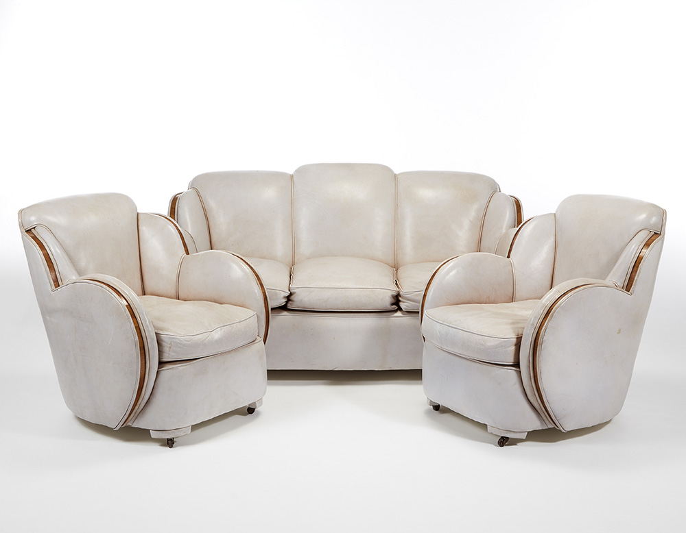 Lotto composto da un divano a tre posti e due poltrone déco con struttura in legno, braccioli impiallacciati in legno chiaro, rivestimento in pelle avorio. Inghilterra, anni '30. (divano: cm 165x82x90; poltrone: cm 74x82x90) (difetti e restauri)
