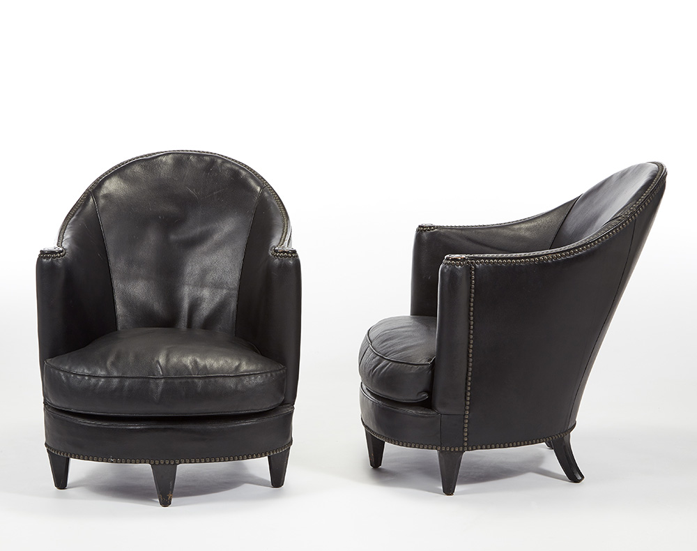 Coppia di poltrone imbottite a pozzetto di gusto déco francese con struttura in legno, braccioli intagliati a volute, rivestimento in pelle nera. Secolo XX. (cm 68x86x75) (lievi difetti e restauri)
