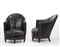 Pair of "pozzetto" armchairs in French déco style with wooden structure, arms carved with volutes, black leather cladding. 20th century. (68x86x75 cm.) (slight defects and restoration)