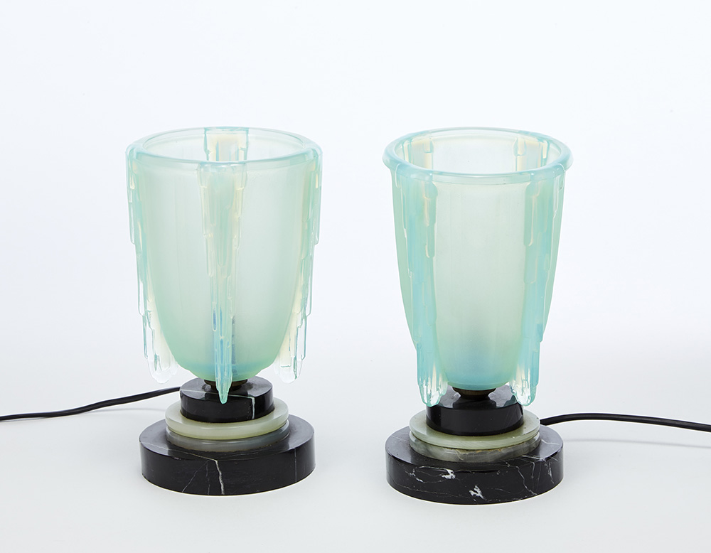 A pair of Art déco table lamps with black and alabaster marble base and diffuser in opalescent green blown glass, acidato on the external surface. 1930s. (h 23 cm.) (slight defects)