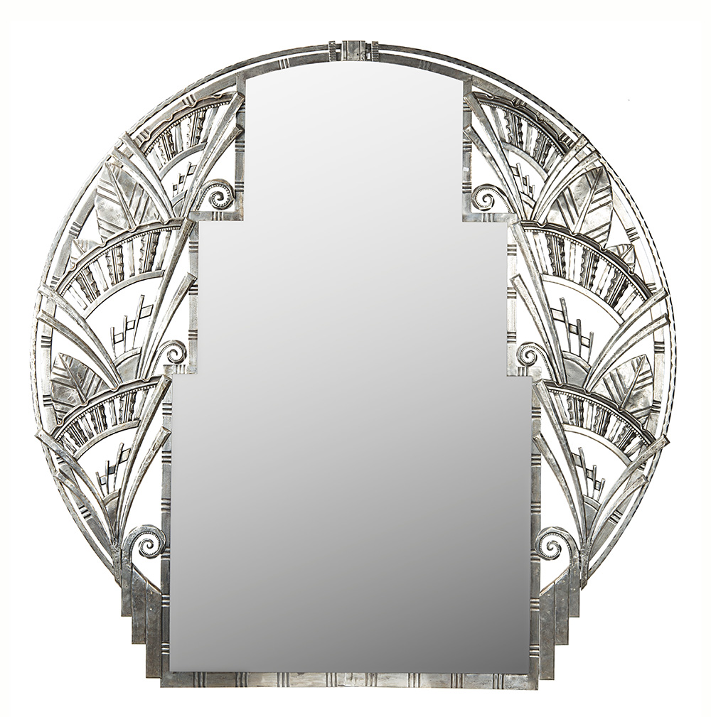 Grande specchiera Art déco di forma scalettata con cornice a profilo circolare in ferro battuto e saldato con elementi decorativi a raggiera e di forma vegetale geometrizzata. 1930ca. (cm 192x190) (lievi difetti)