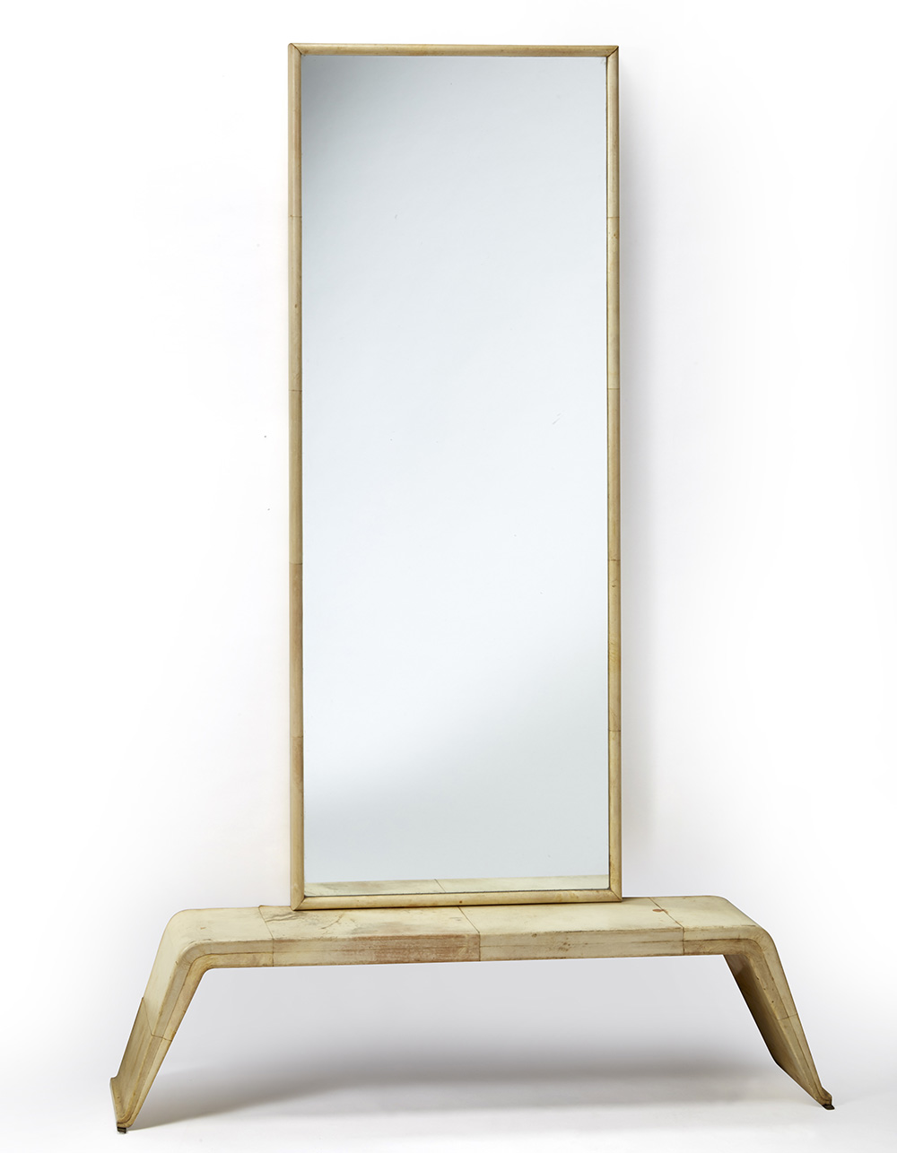 Specchio da appoggio con struttura in legno completamente rivestita in pergamena. Roma, 1939ca. (cm 120x178x22) (difetti) Provenienza Collezione privata, Roma
