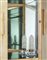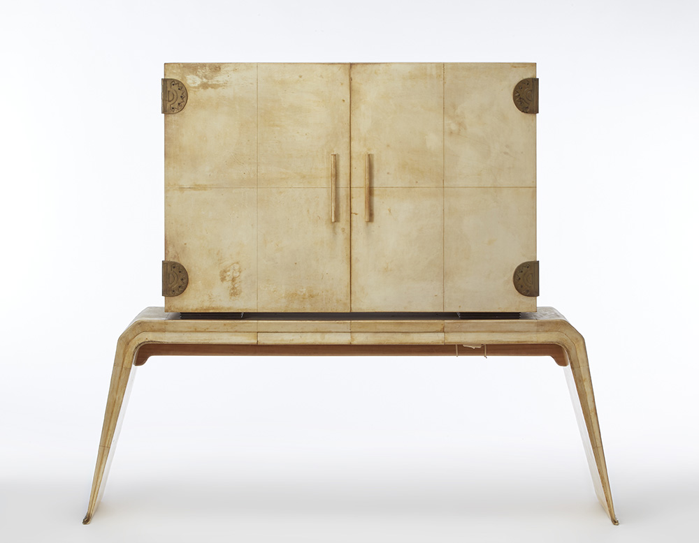 Mobile toilette in legno interamente rivestito in pergamena con struttura a slitta capovolta integrante due cassettini; vano a due ante con piedi in legno ebanizzato a costolature orizzontali e cerniere in placca di ottone decorata con motivo a greca. Interno completamente rivestito a specchio e dotato di due lampade in vetro rostrato della manifattura Barovier & Toso di Murano. Unito a sgabello in legno ebanizzato con seduta rivestita in pelle di leopardo. Roma, 1939ca. (toilette: cm 174x150x40,5; sgabello: cm 90,5x34,5x47) (difetti, mancanze e restauri)