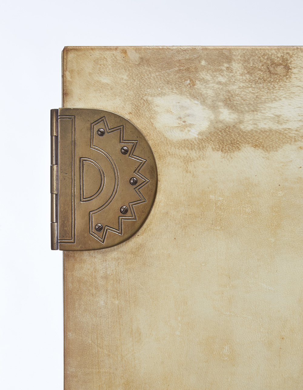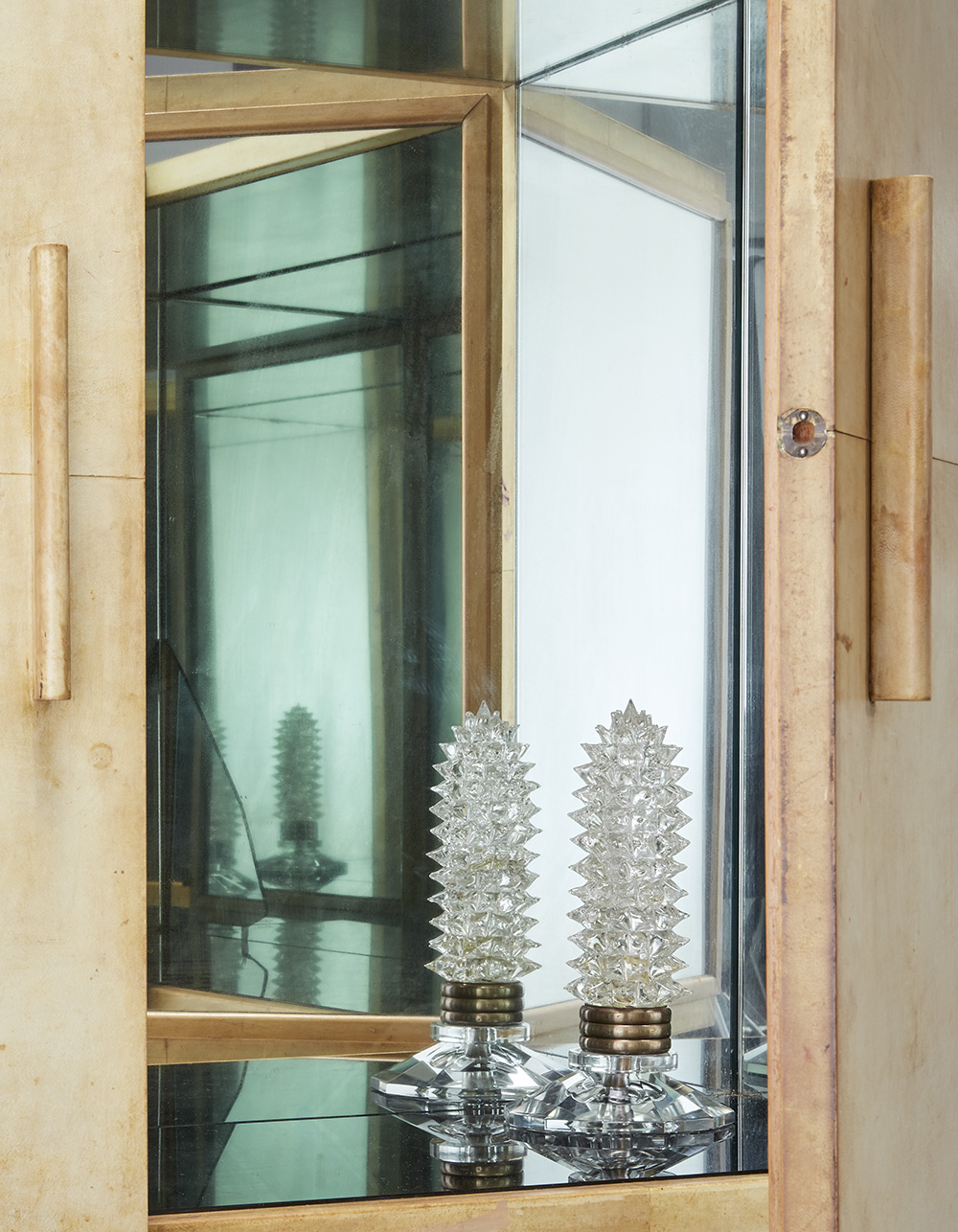 Wooden toilette entirely covered in parchment. Two-door cabinet, ebonized legs, brass plates hinges. Interior completely covered by mirrors and equipped with two "rostrato" glass lamps from the Barovier & Toso manufacture in Murano. United to an ebonized wooden stool with seat covered in leopard leather. Rome, 1939ca. (toilette: 174x150x40.5; stool: cm 90.5x34x47) (defects, losses and restorations)