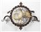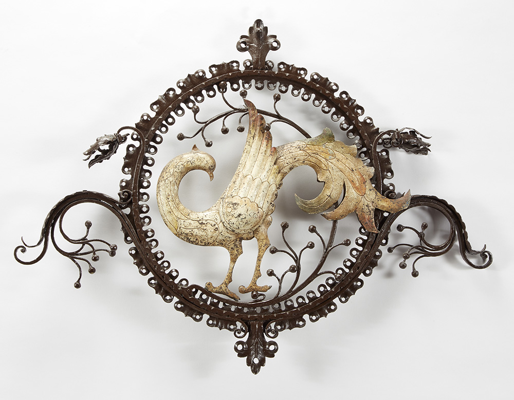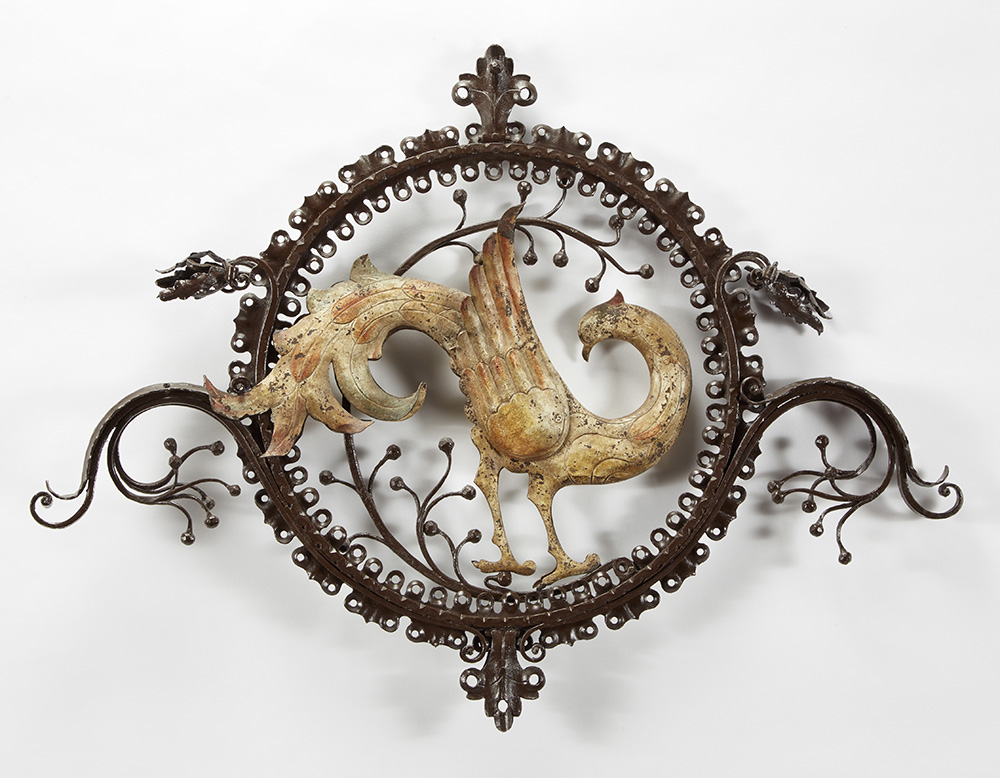 Tondo pediera di letto in ferro battuto inquadrante uccello a tutto tondo in lamina di ferro sbalzata e colorita in bianco, rosso e verde. Milano, anni '30. Tinteggiata con vernice marrone non coeva. (cm 117x74) (lievi difetti)