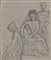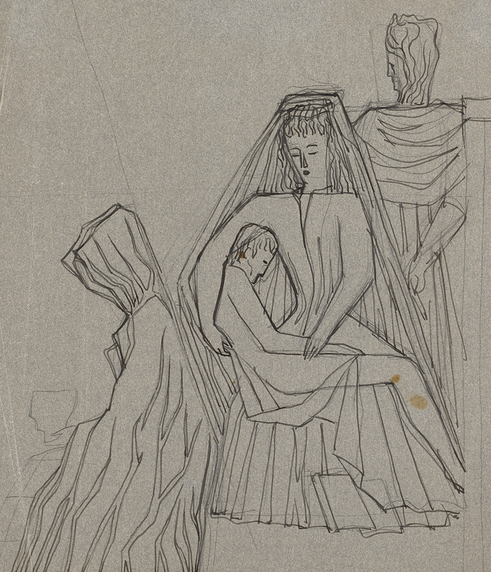Studio per decorazione murale, probabilmente relativa al ciclo ad affresco dello scalone del Palazzo del Bo all'Università di Padova. Milano, 1940ca. Inchiostro di china nero su carta da spolvero. In passe-partout di cartoncino nero. (cm 27x23)