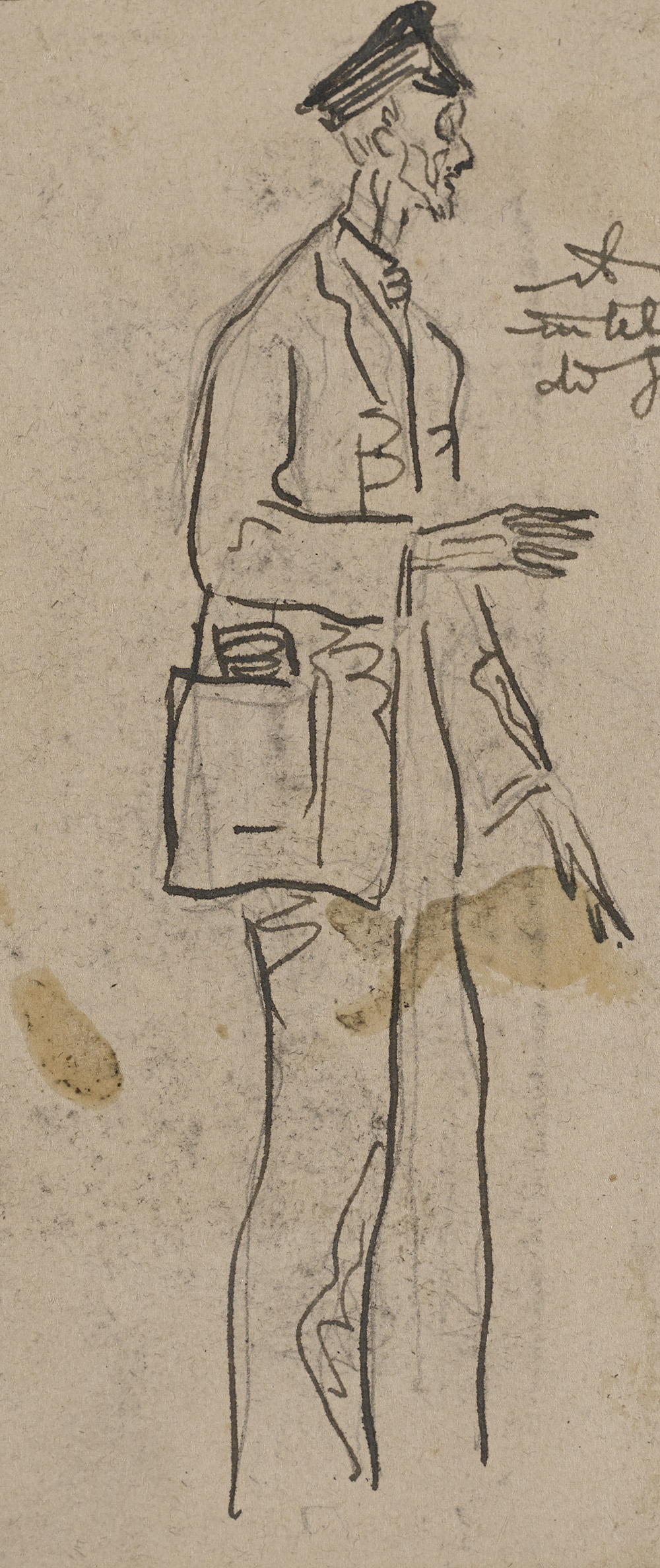 Self-portrait. Italy, 1910s. Black china ink. In black cardboard passe-partout. (14x6 cm.)