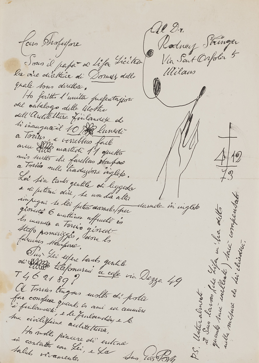 Gio Ponti (Milano 1891 - Milano 1979)Lettera autografa con disegno, inviata a...