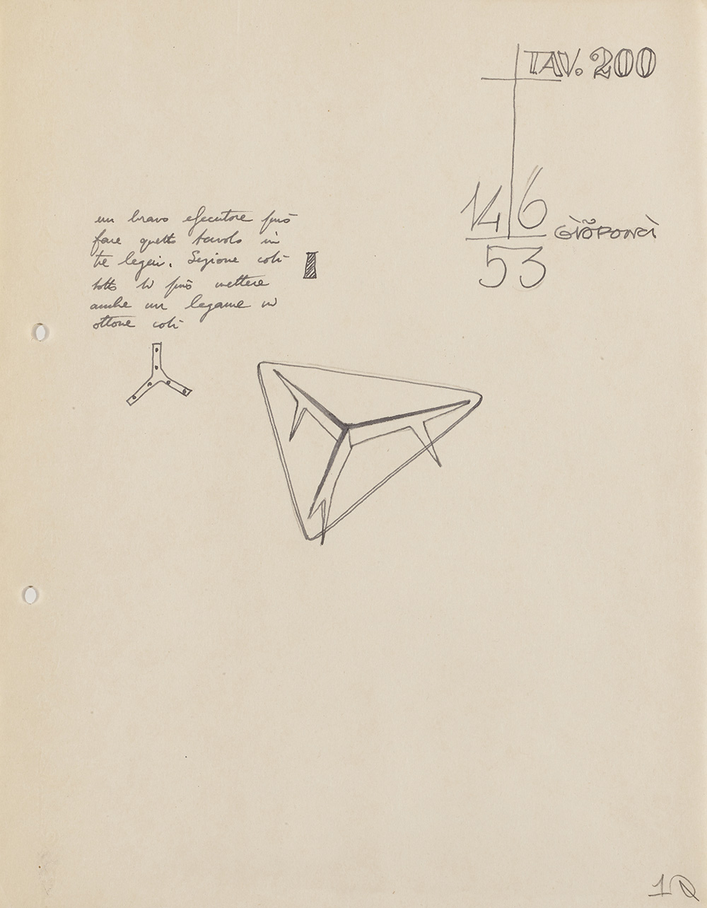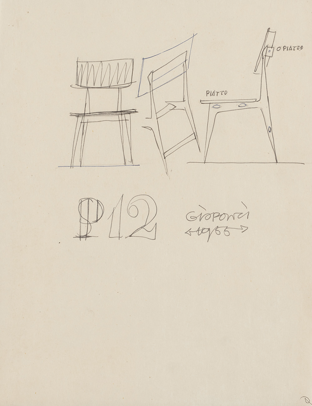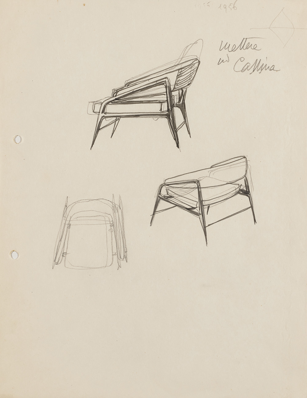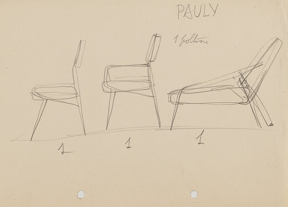 uno studio di poltroncina per Cassina, datato 1956; uno studio per tavolino, con appunti indicazioni manoscritte, titolato "TAV "200", datato 14.6.1953 e firmato; uno studio per sedia, titolato "P12", datato 1955 e firmato; uno studio per scrivania; uno studio per sedia, poltrocina e poltrona tipo "Distex", titolato "PAULY"