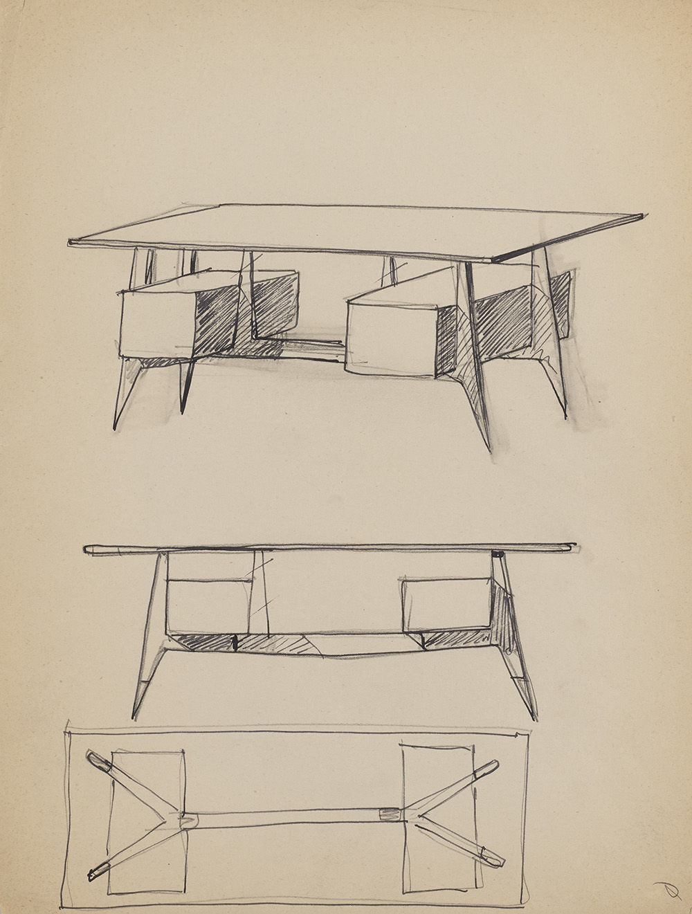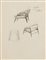 Five sketches for furniture. i.e. sketch of an armchair for Cassina, dated 1956, sketch for an occasional table, with handwritten notes, titled "TAV "200" dated 14.6.1953 and signed; sketch for a chair, titled "P12", dated 1955 and signed; sketch for a desk, armchair and chair "Distex" type titled "Pauly". Milan, 1950s. Graphite and Indian ink on paper. (MIsure diverse) (slight defects)