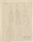 Sketch for seven bottles probably executed for the Cooperativa Ceramica of Imola for Imola. Milan, 1945ca. Graphite on headed paper "ARCHITETTO GIO PONTI INGEGNERI ANTONIO FORNAROLI EUGENIO SONCINI" GLUED TO CARDBOARD. Dedicated "A Daria" [Guarnati] and signed "Gio Ponti" to bottom left. (28.5x22.5 cm.) (slight defects)