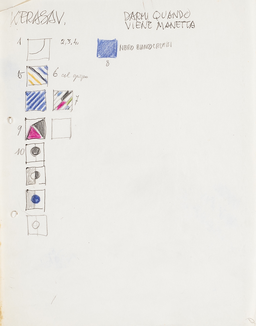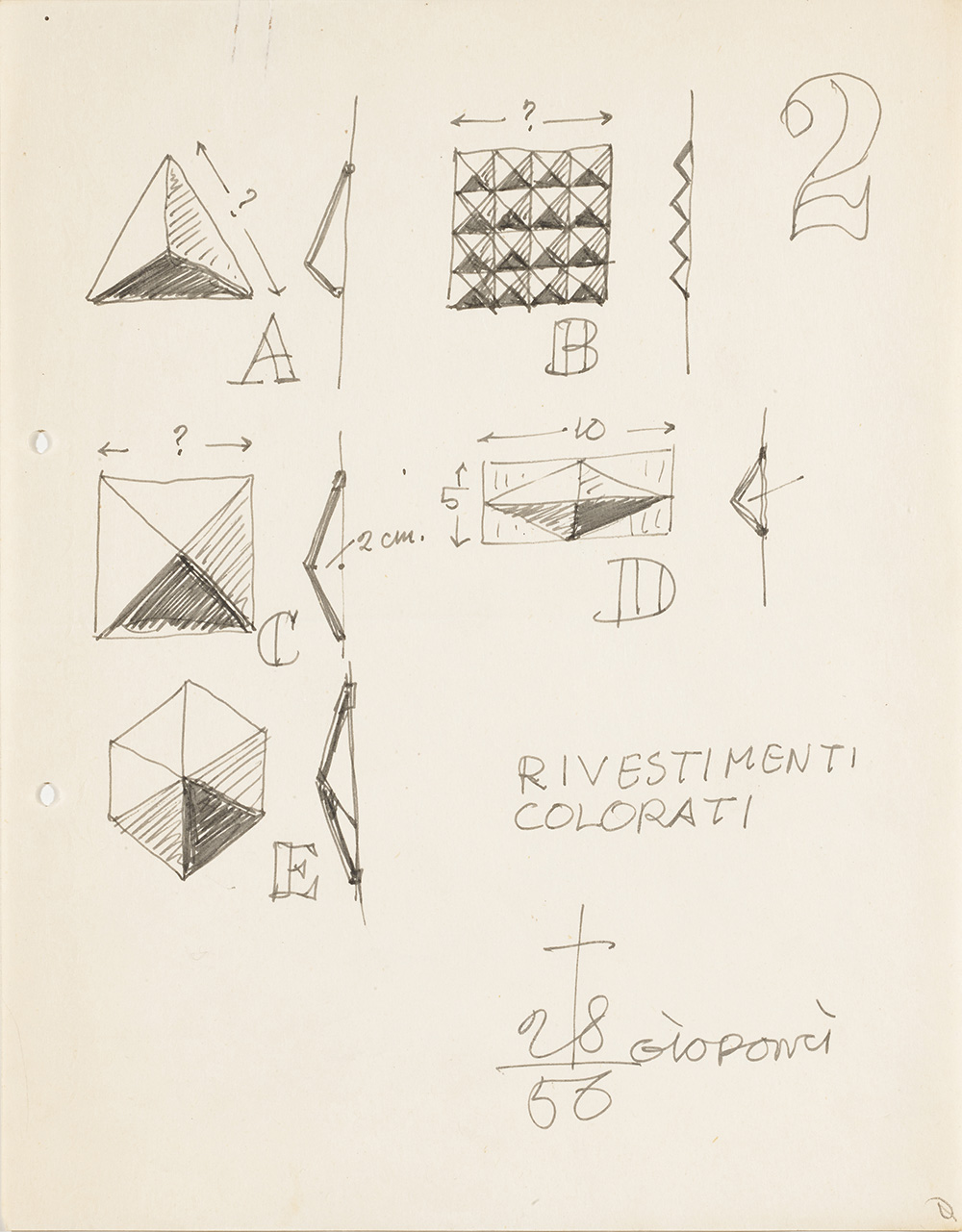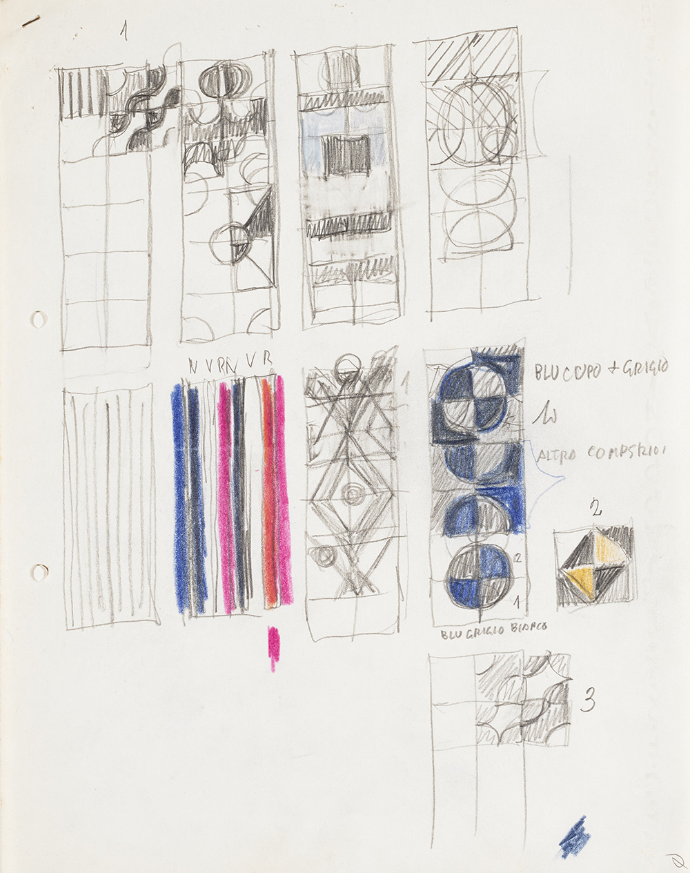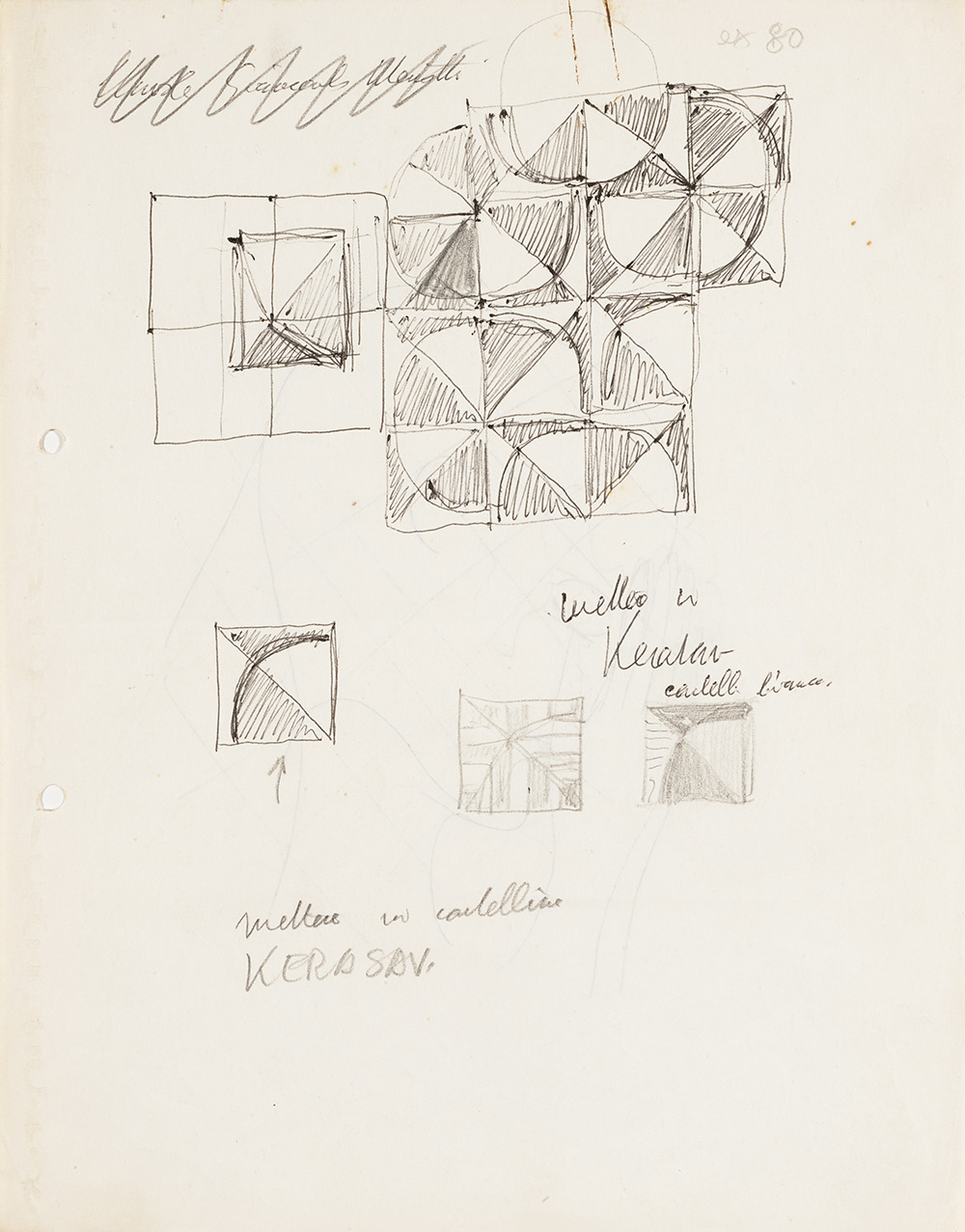 Lotto di sette schizzi per rivestimenti in ceramica, tra i quali uno studio per il rivestimento ceramico dei pavimenti del terzo piano del Shui Hing Department store, Hong Kong, 1978. Al verso di un foglio è presente il disegno di una testa di profilo a mani giunte. Milano, anni '70. Tecnica mista su carta. (Misure diverse) (lievi difetti)