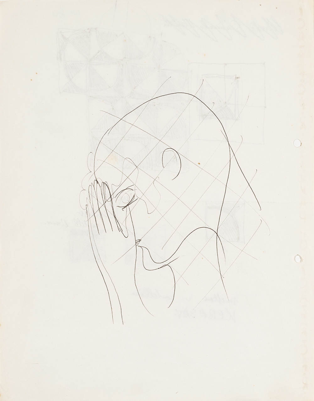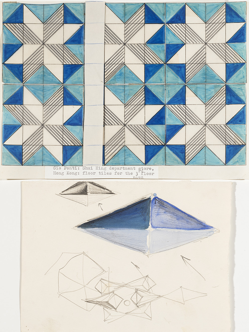 Lot comprising seven sketches for ceramic coverings among which a study for the floor covering on the third floor of the Shui Hing Department Store in Hong Kong 1978. To the reverse of one sheet the sketch of a head with hands joined. Milan, 1970s. Mixed media on paper. (different sizes) (slight defects)