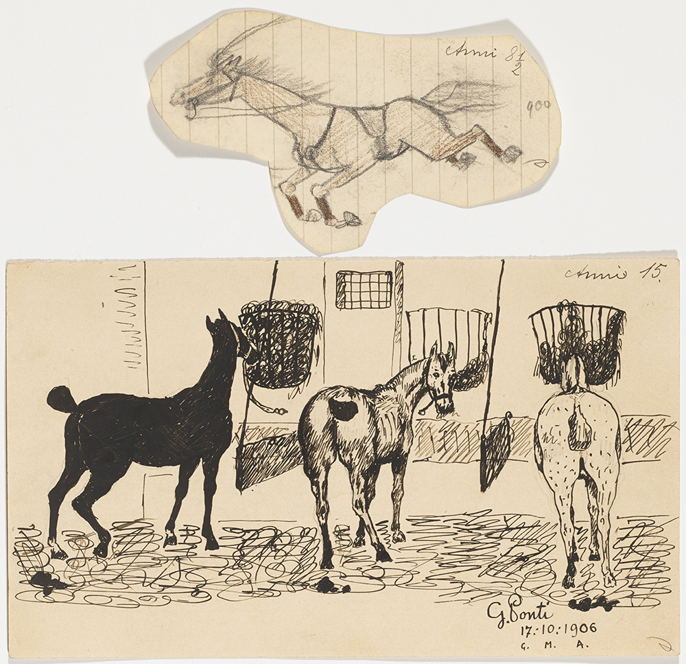 Lotto di undici piccole caricature, paesaggi e ritratti risalenti all'infanzia, al periodo degli studi al Politecnico di Milano e al periodo della prima guerra mondiale. Alcuni siglati, firmati e datati. Milano, 1896-1918. (Misure diverse) (lievi difetti)