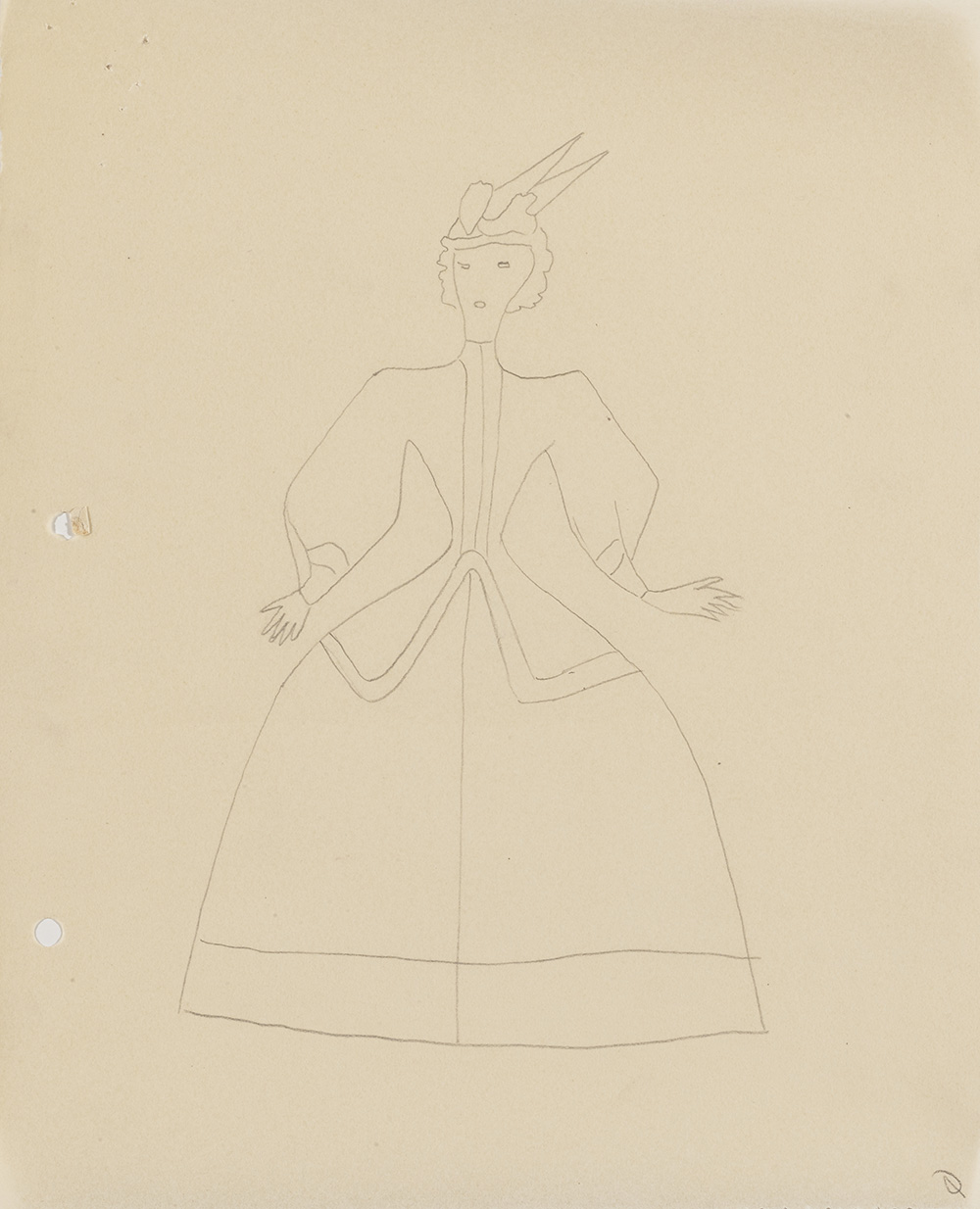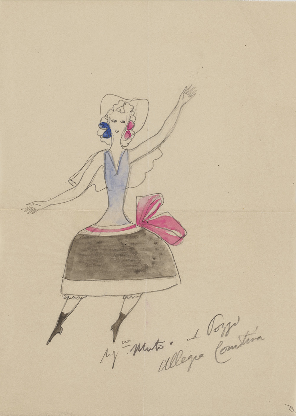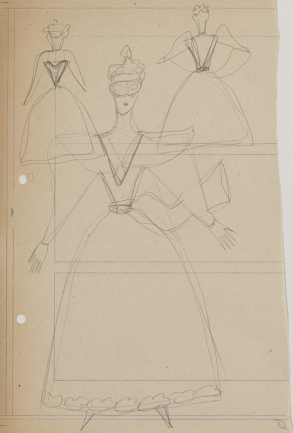 Three sketches for stage costumes for the ballet "Festa Romantica" by G. Piccoli. Milan, 1944. Graphite and coloured felt pen on paper. Bearing handwritten notes. (different sizes) (slight defects)