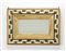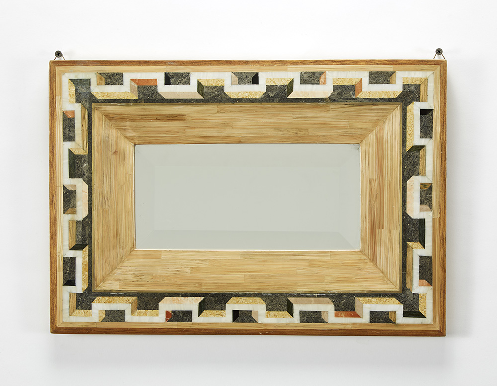 Cornice bordata e intarsiata in legni diversi, ottone, alabastro e scagliola policroma. Decoro prospettico alla greca. Montata a specchio molato. Milano, secolo XX. (cm 46x32)
