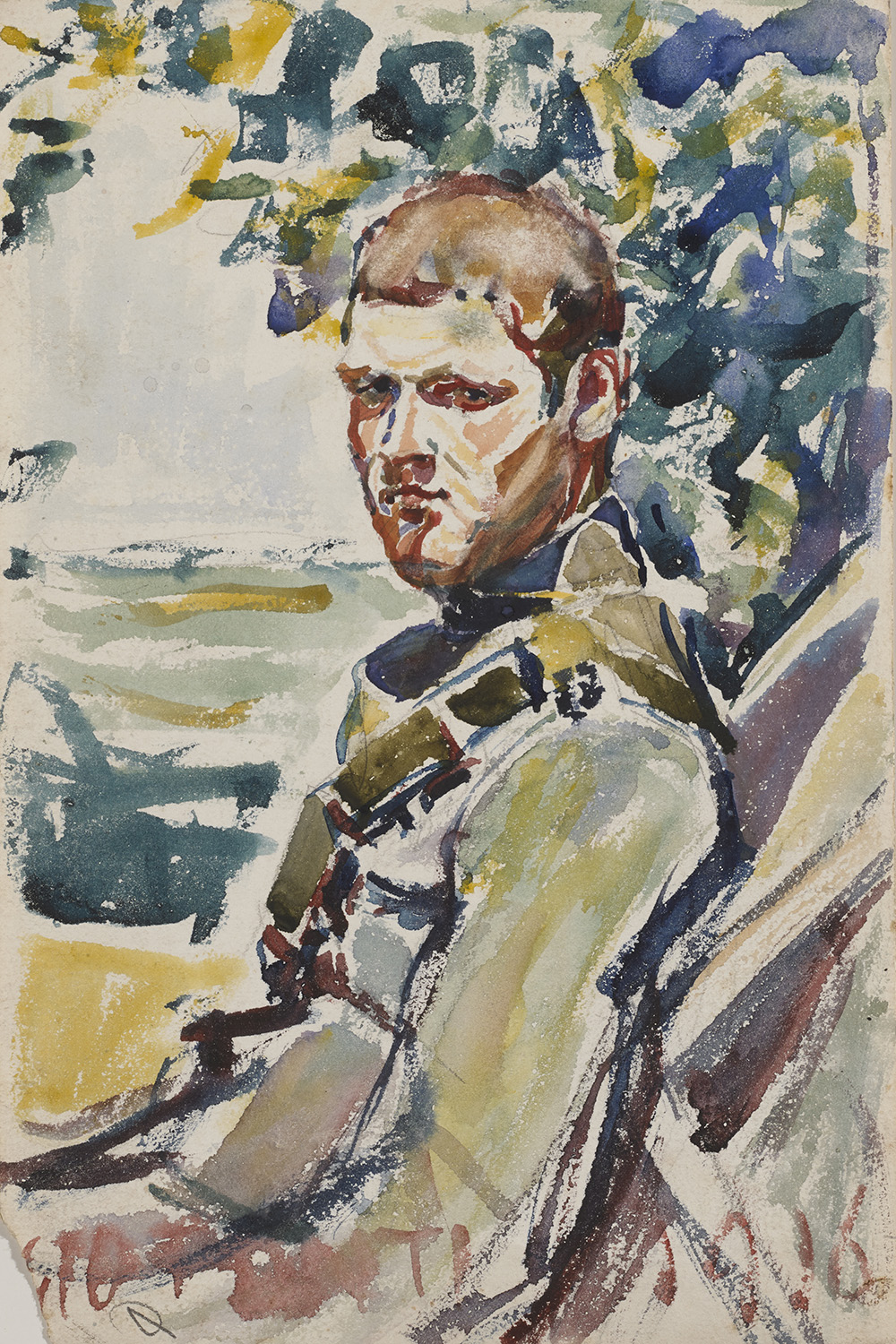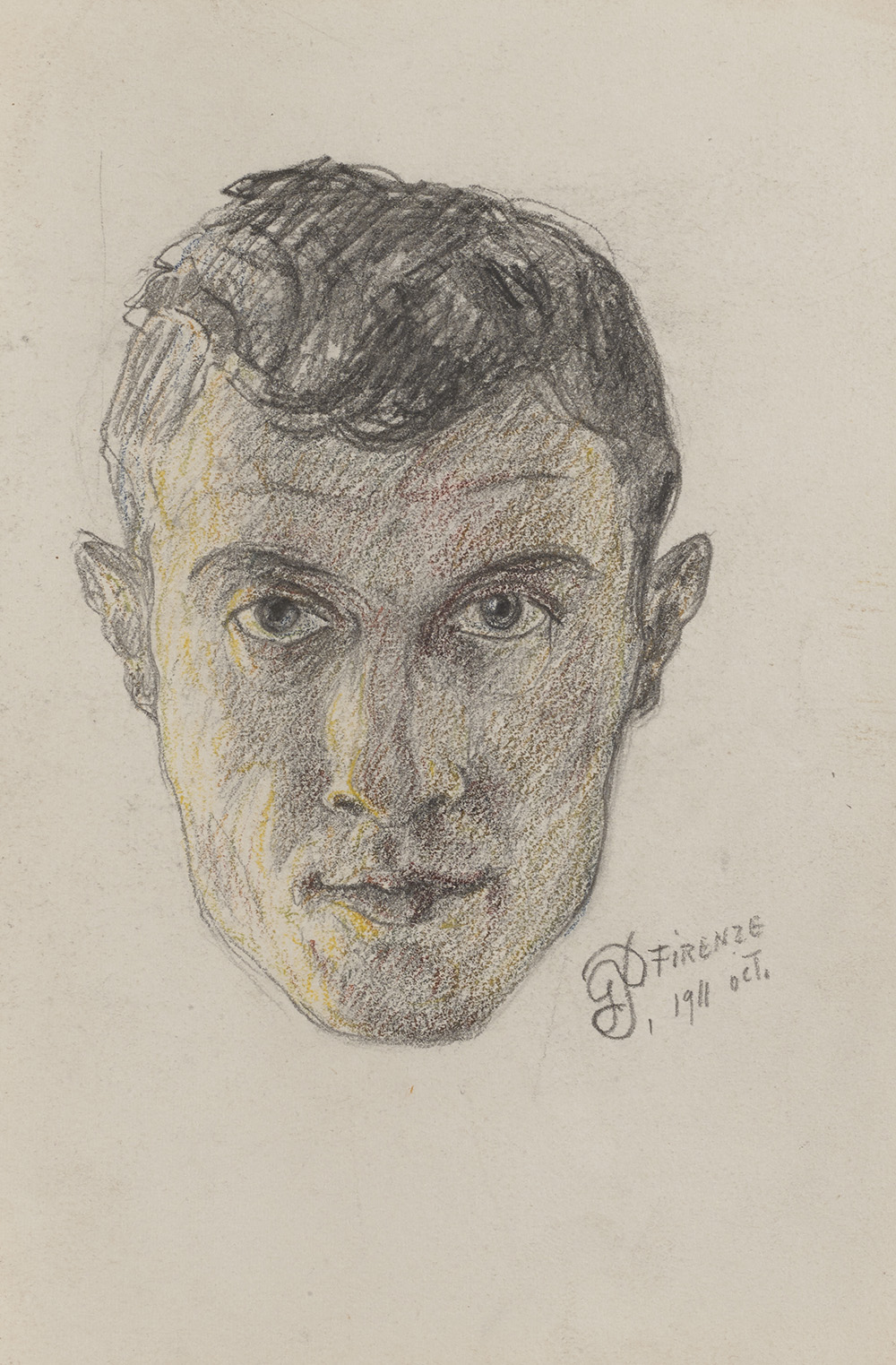 Lot comprising two self-portraits and a sketch for faces.. A self-portrait initialled "GP", placed in Florence and dated October 1911, exeuted with graphite and coloured pencils on paper; a probable self-portrait in uniform signed "GIO PONTI 1916", executed with polychrome watercolours on cardboard; sketches for two heads by unknown author, ink on paper glued to cardboard. (different sizes) (slight defects)