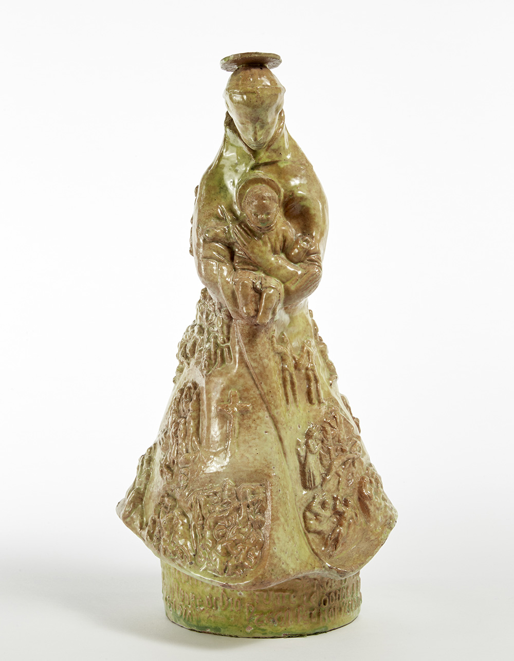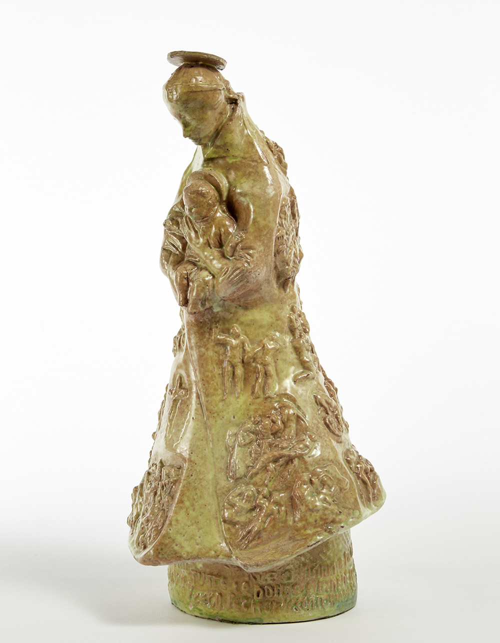 Scultura in ceramica smaltata in policromia nei toni del verde, del giallo e dell'ocra. Italia, metà anni '40. Idea originale di Gio Ponti, 1943; preghiera iscritta in rilievo alla base di Lisa Ponti, 1944; scultura di Ettore Calvelli, eseguita in più repliche dal 1944. Tiratura ignota. Firmata "Ettore Calvelli" alla base del mantello. (h cm 43) (lievi difetti)