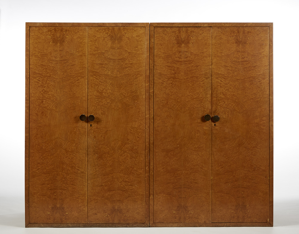 A pair of two-door rationalist wardrobes. Milano / Como, 1930s. Briar-root veenered structure, brass handles; maple wood veneered interiors. (100x164.5x59.5 cm.) (defects and losses)