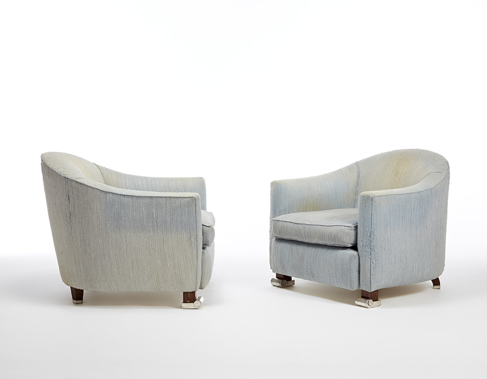A pair of armchairs, modification of the model "Crapaud 266 NR / 10 AR" of the Ruhlmann Répertoire. Execution by Atelier E. J. Ruhlmann, Paris, 1931ca. Ash-wood structure, not-original blue wool fabric covering, wooden legs with bronze silver-plated ferrules, derived from the ferrules of the bench model "500 NR / 110 AR" of the Ruhlmann Répertoire. (71x73x80 cm.) (defects, modifications and restorations)