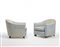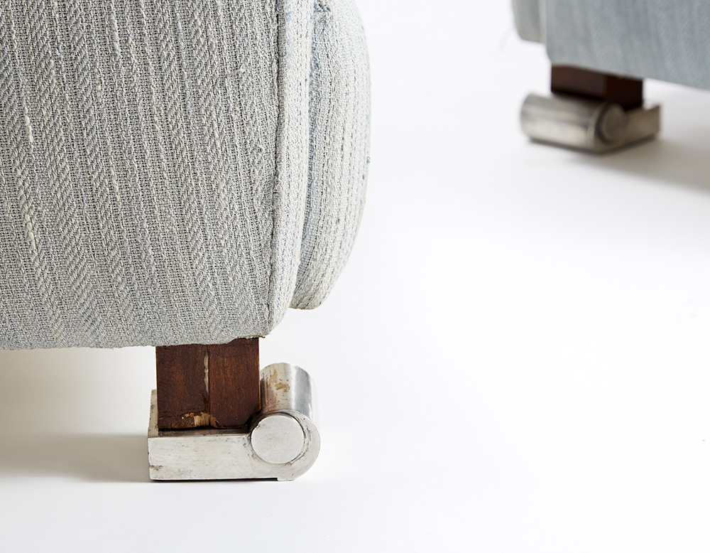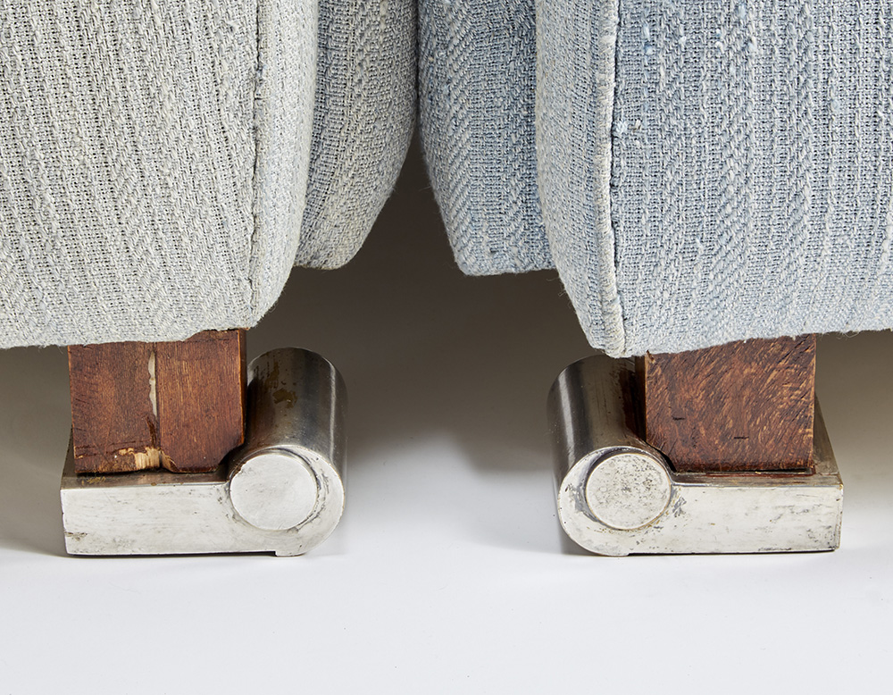 Coppia di poltrone, modifica del modello "Crapaud 266 NR / 10 AR" del Répertoire di Ruhlmann. Esecuzione Atelier E. J. Ruhlmann, Parigi, 1931ca. Struttura in legno massello di frassino, rivestimento non originale in tessuto di lana azzurra, piedi in legno con puntali in bronzo argentato, derivati dai puntali della panchetta modello "500 NR / 110 AR" del Répertoire Ruhlmann. (cm 71x73x80) (difetti, modifiche e restauri)