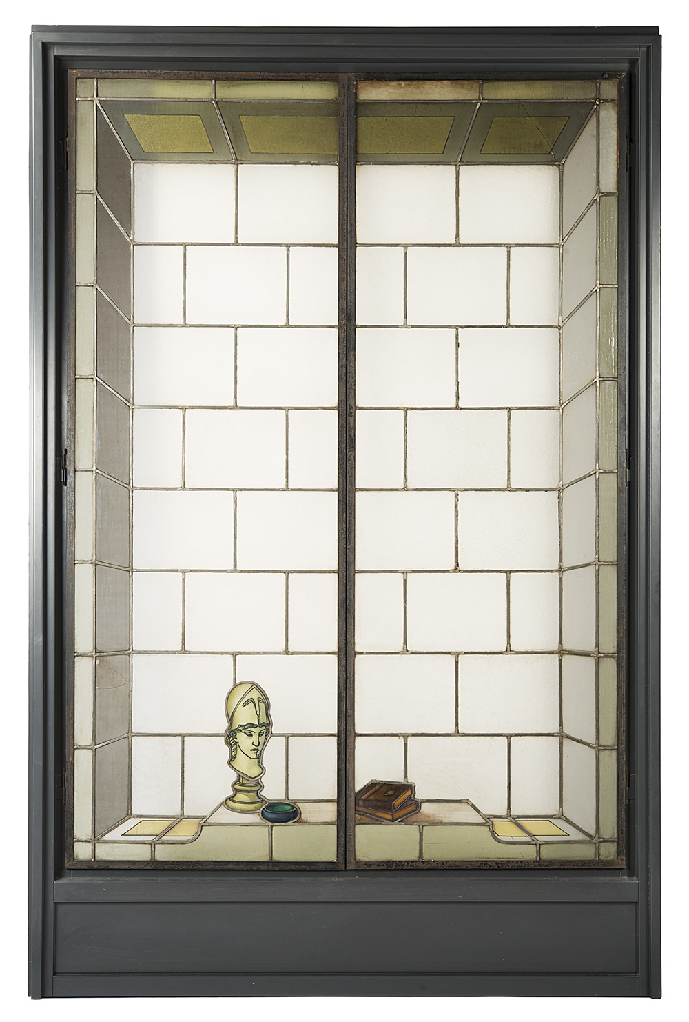 Pair of polychrome glass panels on iron frame with metaphysical subject representing a window with shelf with two books, a greek bust, a bowl. Italy, 1930s. (138x197 cm.) (slight defects)