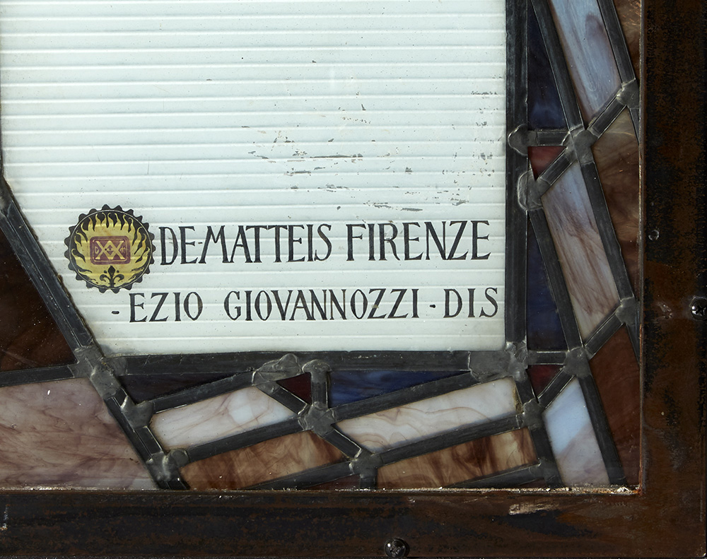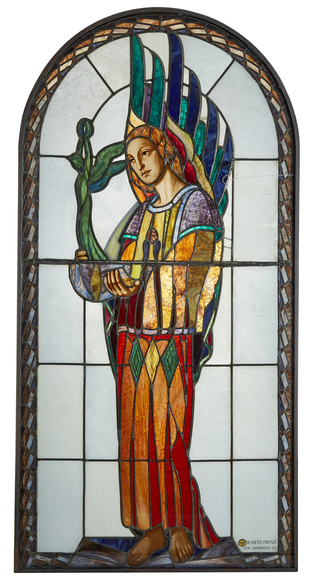 Large glass panel with arched summit decorated with allegorical figure of an angel holding a Winged Victory. Execution by De Matteis, Florence, 1920ca. Polychrome Monaco glass, translucent and variegated, painted glass transparent cannete glass base painted white. Safety glass protection on both sides. Bearing inscription "De Matteis Firenze - Ezio Giovannozzi dis" at bottom right. (265x134 cm.) (slight defects and restoration)