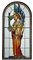 Grande vetrata con sommità ad arco, decorata con figura allegorica di angelo reggente una vittoria alata. Esecuzione De Matteis, Firenze, 1920ca. Vetri policromi Monaco, traslucidi e variegati, vetro dipinto, fondo in vetri canneté trasparenti dipinti a smalto bianco. Protezione in vetri antisfondamento da ambo i lati. Recante iscrizione "De Matteis Firenze - Ezio Giovannozzi dis" in basso a destra. (cm 265x134) (lievi difetti e restauri)