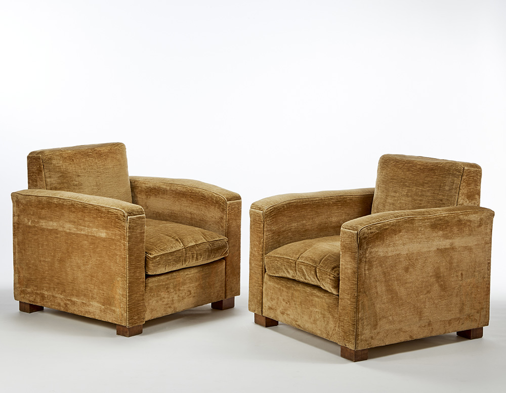 Coppia di poltrone imbottite. Italia, 1935ca. Struttura in legno, piedi di forma cubica in legno massello di rovere, rivestimento in velluto beige. (cm 79x82x89) (difetti)